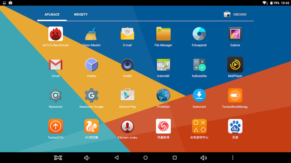 Ani v tomto případě se Teclast nepouštěl do výrazných experimentů a zvolil čistou verzi systému s výchozím launcherem. Tentokrát je ovšem v systému předinstalováno několik aplikací. Ty jsou bohužel v čínštině, takže jsou v našich končinách nevyužitelné. Naštěstí je lze snadno odinstalovat, takže nebudou zbytečně zabírat místo v interní paměti.