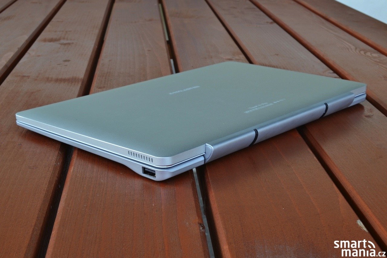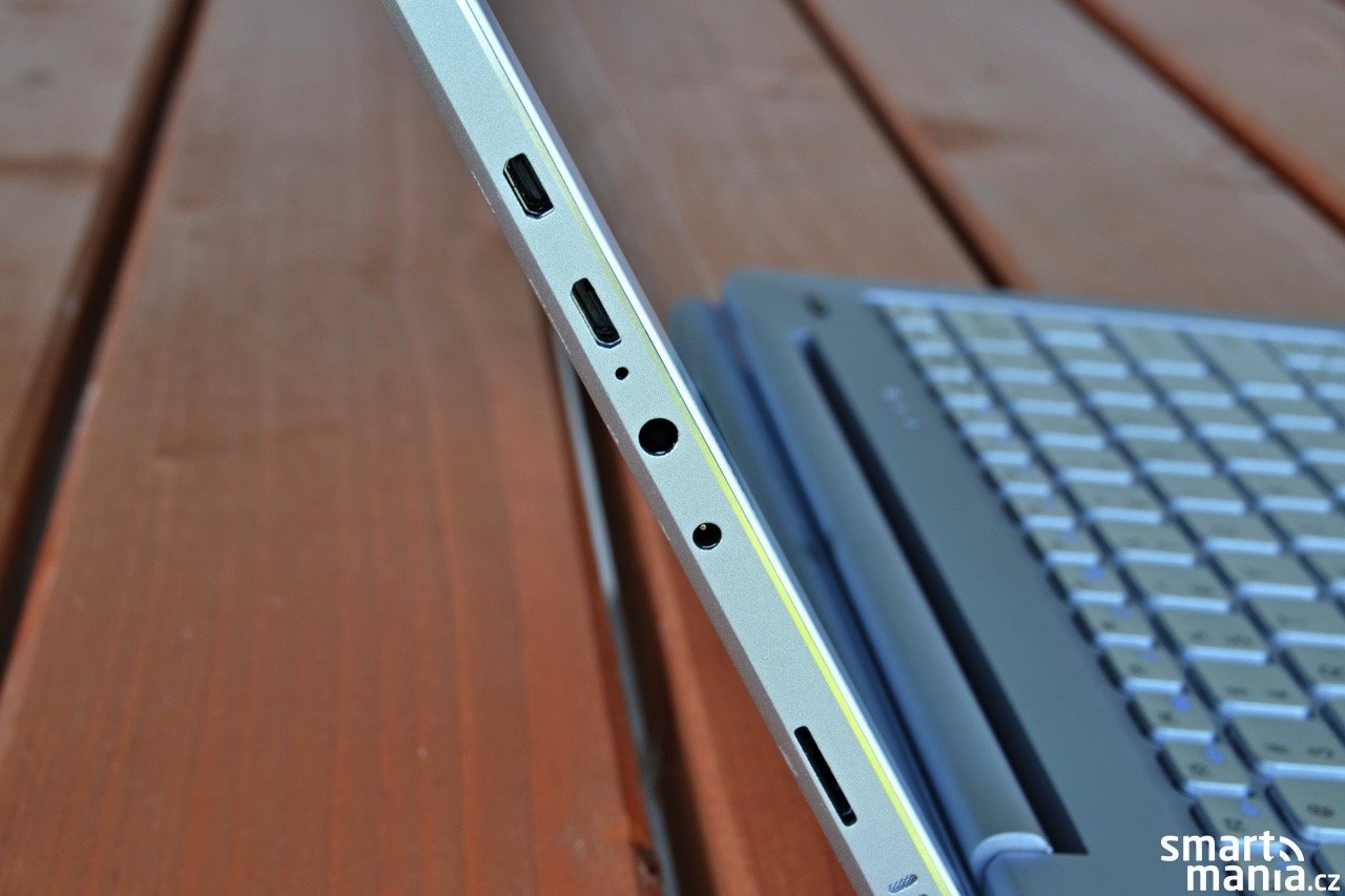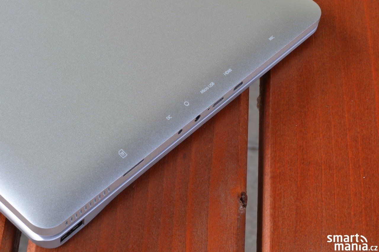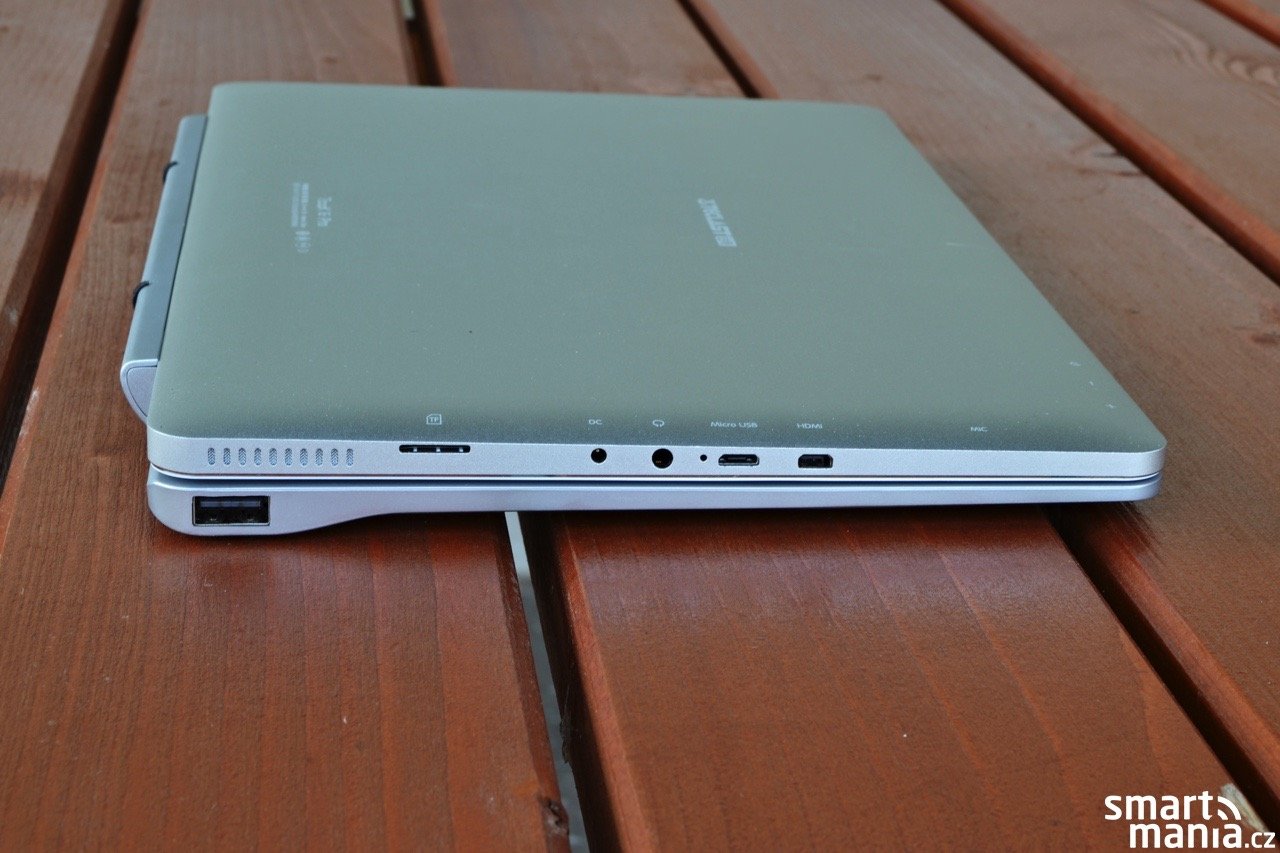 Veškerá konektorová výbava se nachází na levém boku zařízení. Kromě obvyklého microUSB a sluchátkového výstupu je ve výbavě také výstup microHDMI a samostatný konektor pro napájení. Nechybí ani čtečka paměťových karet formátu microSD. Na spodní hraně jsou umístěny kontakty zajišťující komunikaci s připojitelnou klávesnicí.