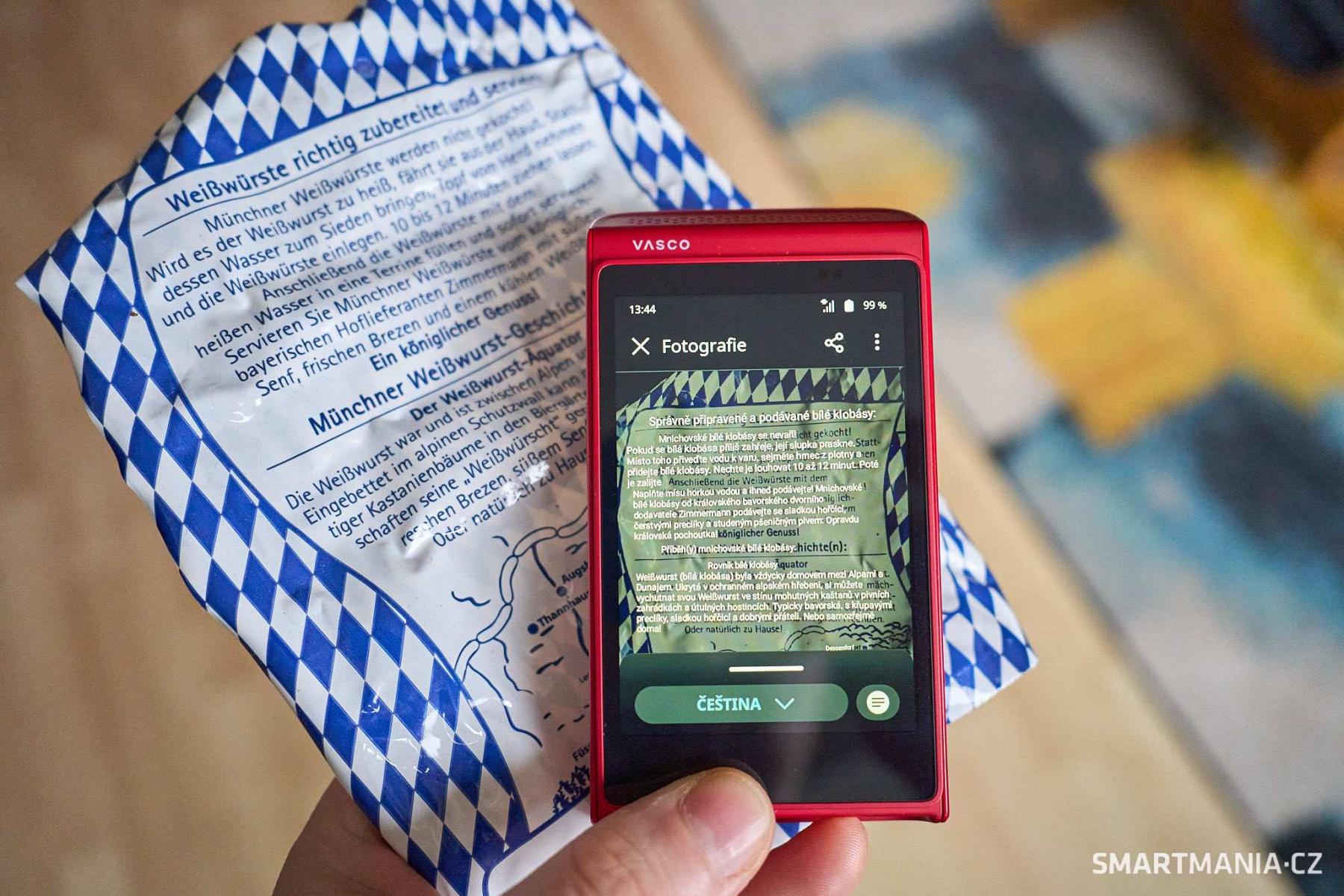 Překlad skrze fotografii jsem zkoušel na třech různých scénářích. Jedním z nich byl pracovní e-mail hned ve dvou cizích jazycích plný odborných termínů, se kterým si kapesní překladač poradil velmi dobře. Druhý scénář se týkal překladu složení produktu na krabičce. Tady už to dopadlo o něco hůře, možná i proto, že krabička měla tvar válečku. Třetí scénář byl německý text týkající se bavorských klobás, který nebyl těžký na překlad, ale horší na správné vyfocení. Po chvíli snahy si ale kapesní překladač Vasco Translator Q1 s tímto úkolem poradil.