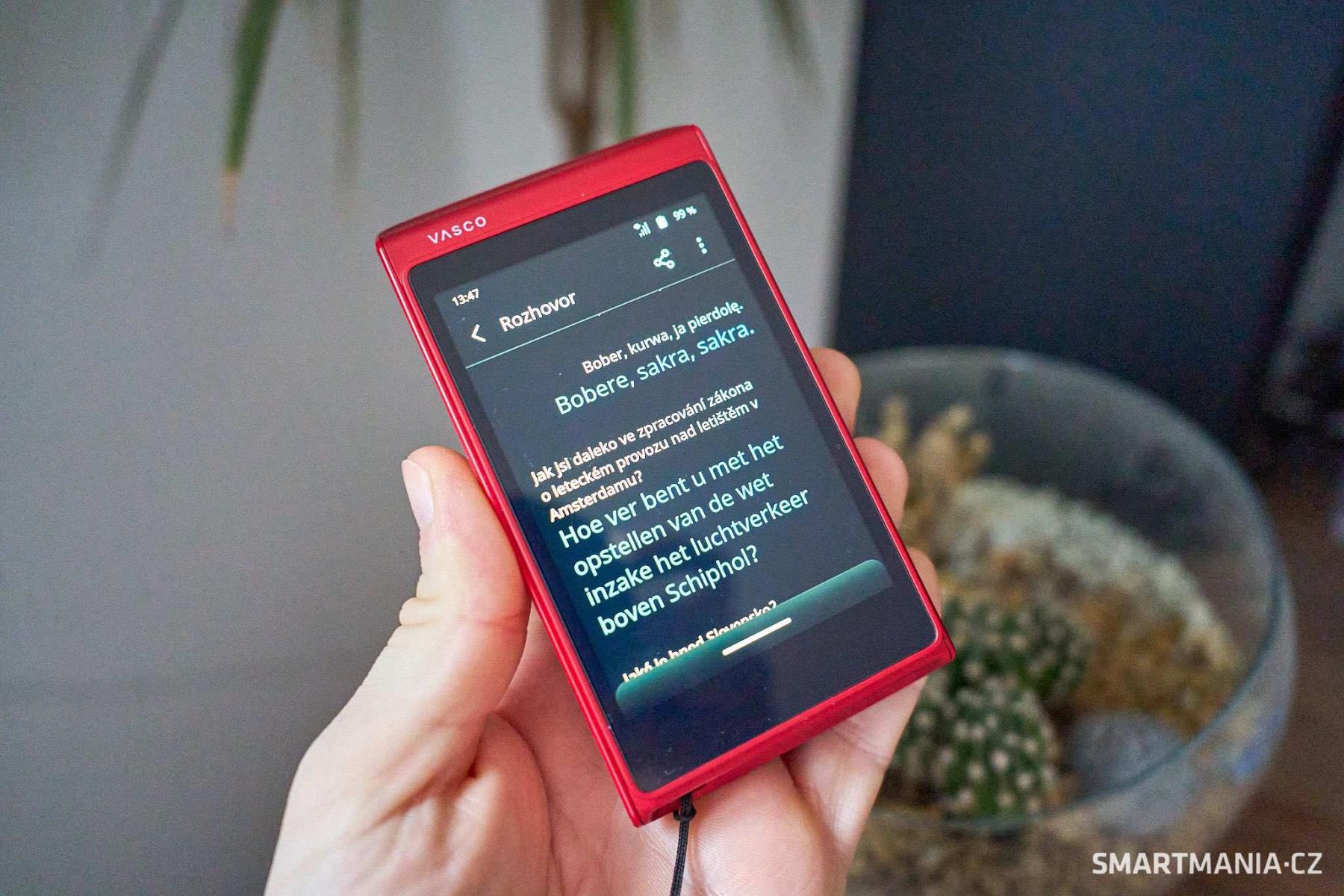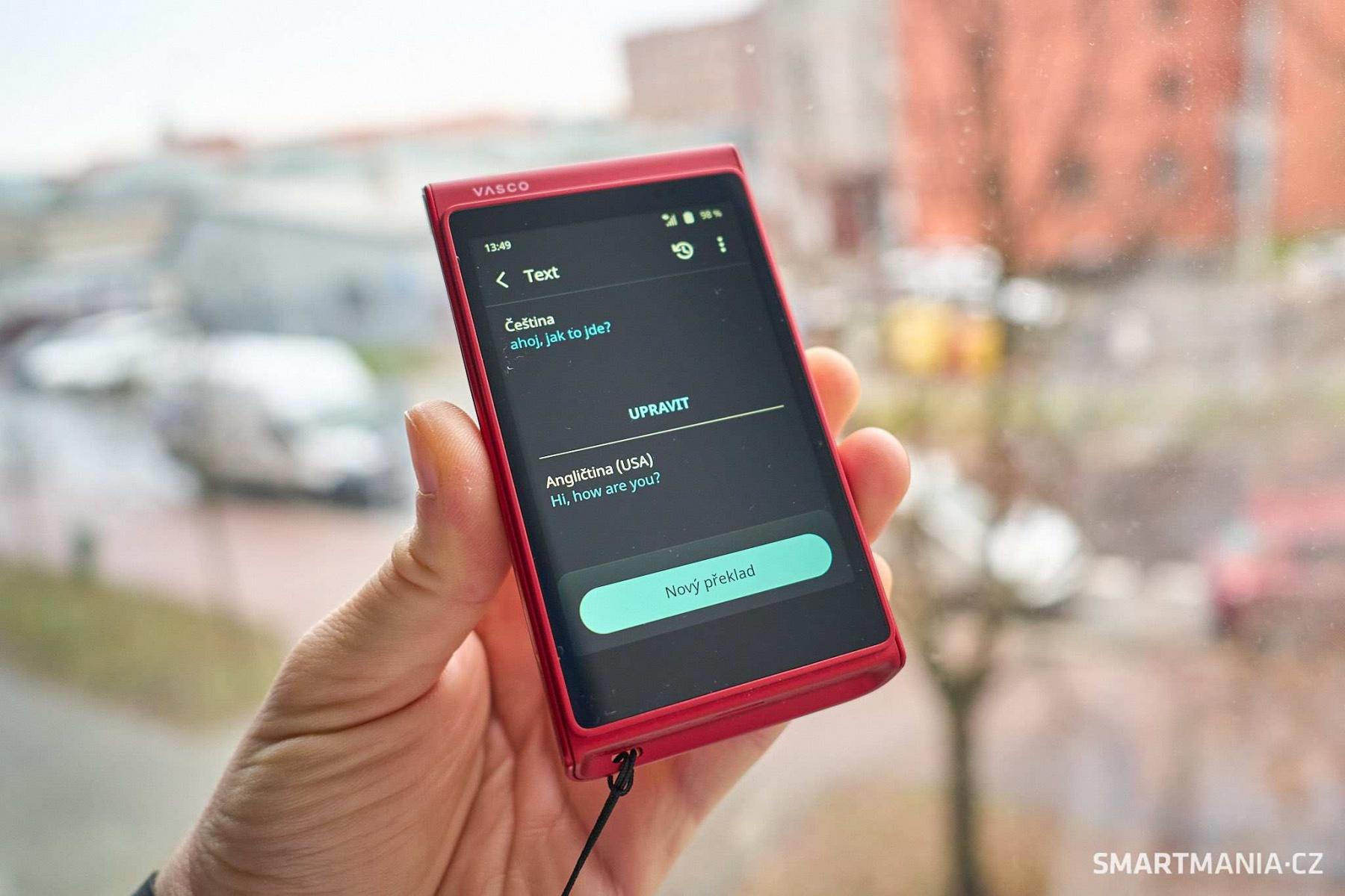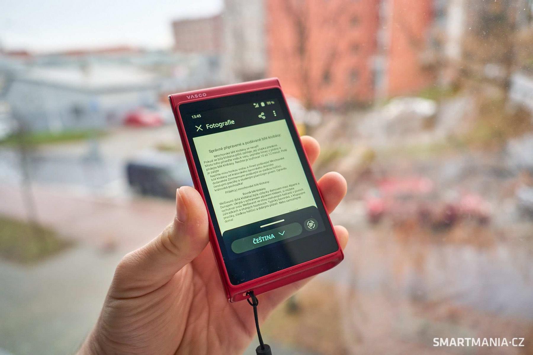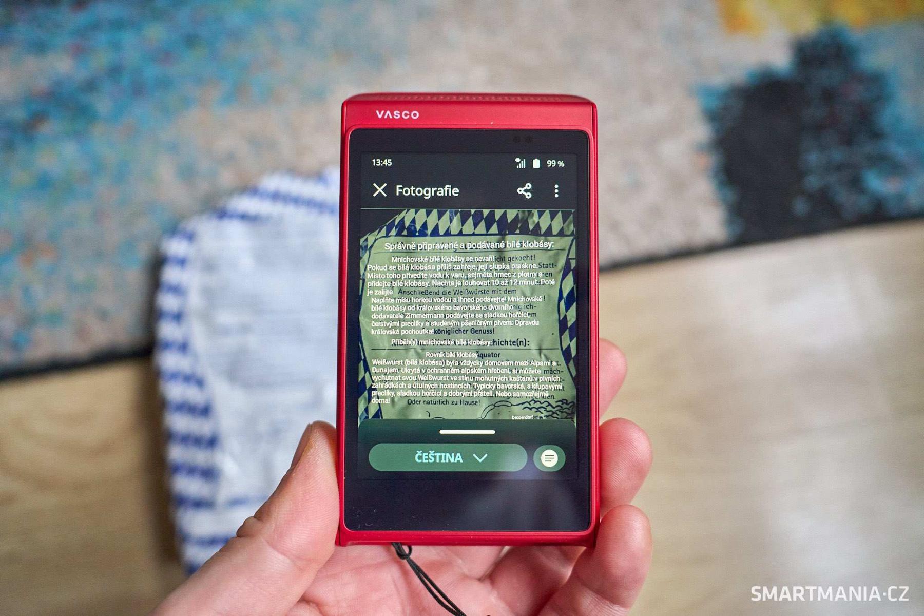 Jednou z možností, která mě zaujala, je překlad textu s pomocí integrovaného fotoaparátu. Jeho parametry Vasco bohužel nezmiňuje, nicméně jedná se o 13Mpx snímač a nejde o žádnou hitparádu – za zhoršených světelných podmínek na tento způsob překládání zapomeňte, nepodaří se vám pořídit dostatečně kvalitní snímek, jež by nebyl rozmazaný a LED blesk ne vždy situaci vyřeší. Na druhou stranu za dne se jedná o velmi rychlou a použitelnou variantu.