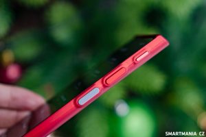 Vpravo je umístěno vypínací tlačítko, které je na můj vkus trochu výše, ale dá se na něj palcem dosáhnout. Muselo ustoupit dvěma speciálním tlačítkům. Když zmáčknete šedé, spustí se mikrofon a můžete začít mluvit, avšak musíte být v dané aplikaci. Druhé tlačítko, dál od vás, slouží pro aktivací mikrofonů na horní straně. Je škoda, že na tlačítka nejsou navázány i jiné funkce.