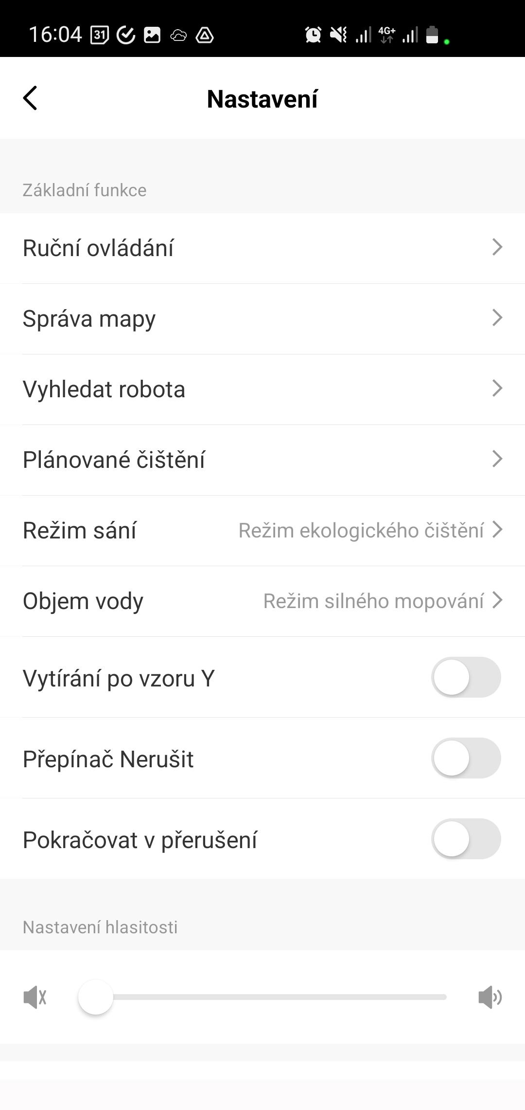 Teprve druhé nastavení ukrývá užitečné podnabídky, které budete využívat mnohem častěji. Tady se nachází možnost ovládat robota manuálně, ukládání různých map (například pro různá patra), vyhledání robota, plánované čištění, režimy vysávání a mopování, vytírání po vzoru Y, režim nerušit, pokračování ve vysávání po přerušení, nastavení hlasitosti, záznamy posledních úklidů a výběr hlasu, kterým s vámi bude vysavač komunikovat.