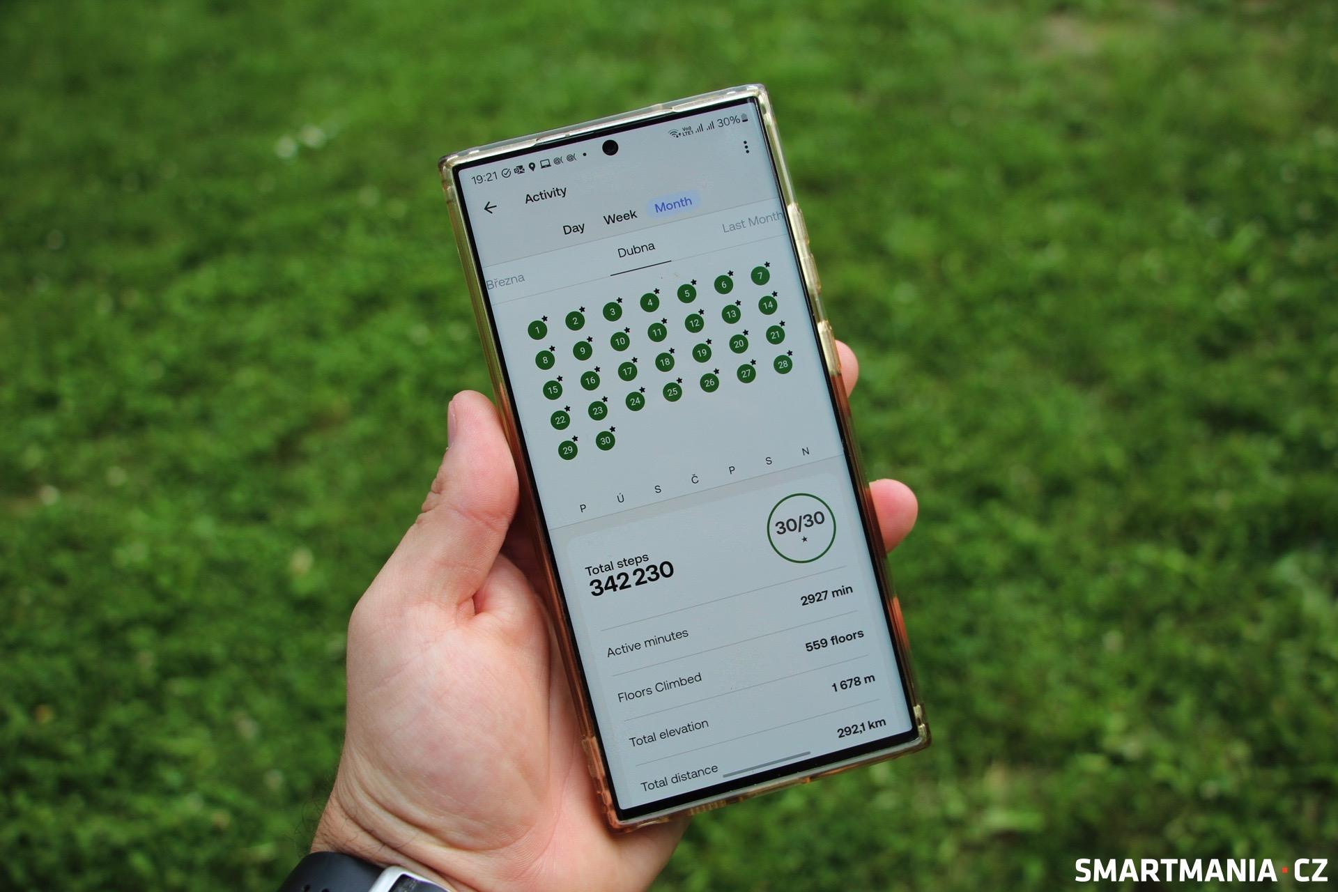 Informace o zdraví, sportu či spánku můžete sledovat v denních, týdenních nebo měsíčních přehledech, stejně tak si můžete prohlédnout vývoj tepové frekvence a teploty v rámci jednotlivých dní. Hluboko v aplikaci dokonce najdete odznáčky, které vám vaše úspěchy (počet kroků za den, celková ušlá vzdálenost, nastoupaná výška) přirovnají k nějakému zajímavému milníku – já jsem kupříkladu vodorovně ušel celou Route 66 (4 tisíce km) a svisle dosáhl stratosféry (39 km).