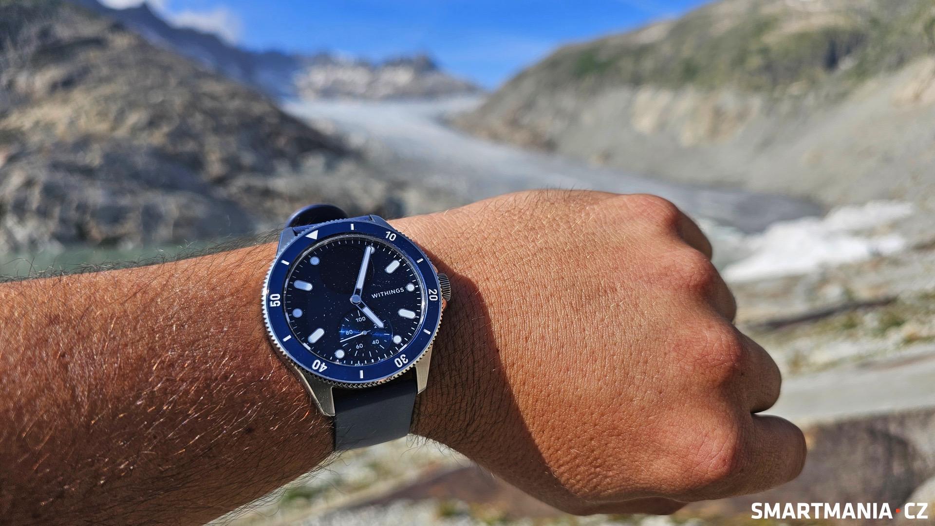 Když už je řeč o vodě, hodinky se pyšní odolností 10 ATM (100M), což znamená, že by měly ustát ponor do hloubky až 10 metrů. Já sám jsem je během letní dovolené podrobil křestu vodou ve švýcarských jezerech, kde jsem s nimi téměř dva týdny plaval a skákal z pontonů do přibližně 3metrové hloubky, a žádná voda se dovnitř nedostala. S klasickými ScanWatch bych se do tohoto podniku nepouštěl – na internetu najdete spousty zpráv od nešťastných majitelů, kterým se odlepilo dýnko (spodní část) a hodinky tím přišly o schopnost nabíjení. Hádáte dobře, opravy se od Withings nedočkali, maximálně slevy na příští nákup.