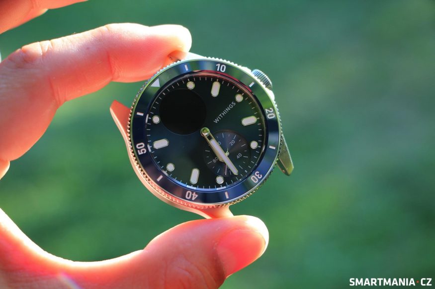 Rozmístění prvků v ciferníku je stejné jako u ostatních hodinek Withings – nad středem se nachází drobný kruhový displej zobrazující veškeré „chytré“ funkce, pod středem zase najdeme typický analogový ukazatel nachozených kroků, respektive procenta plnění nastaveného denního cíle. Bohužel stále není možné nastavit si jako denní cíl například spálené kalorie či jiné sportovní skóre – ručičkou pohnou pouze a jen nachozené kroky.