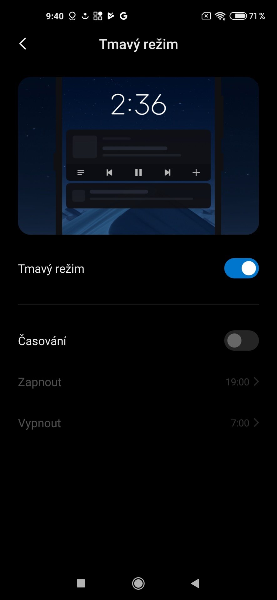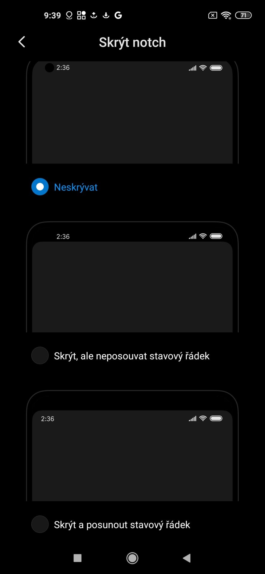 Velmi mne potěšilo velké množství různého nastavení. V displeji je průstřel, ale Xiaomi vám dovolí jej skrýt dvěma různými způsoby. Je zde opravdu perfektně zpracované menu barevného schéma, ve kterém si displej nastavíte podle svých představ. Samozřejmostí je tmavý režim s načasováním, nastavení haptické odezvy, můžete nastavit druhý prostor pro práci nebo zábavu a pro menší ruce se bude hodit možnost virtuálního zmenšení displeje až na 3,5 palce. Asi byste bez toho dokázali žít, ale je příjemné, že Xiaomi dává takové možnosti nastavení.
