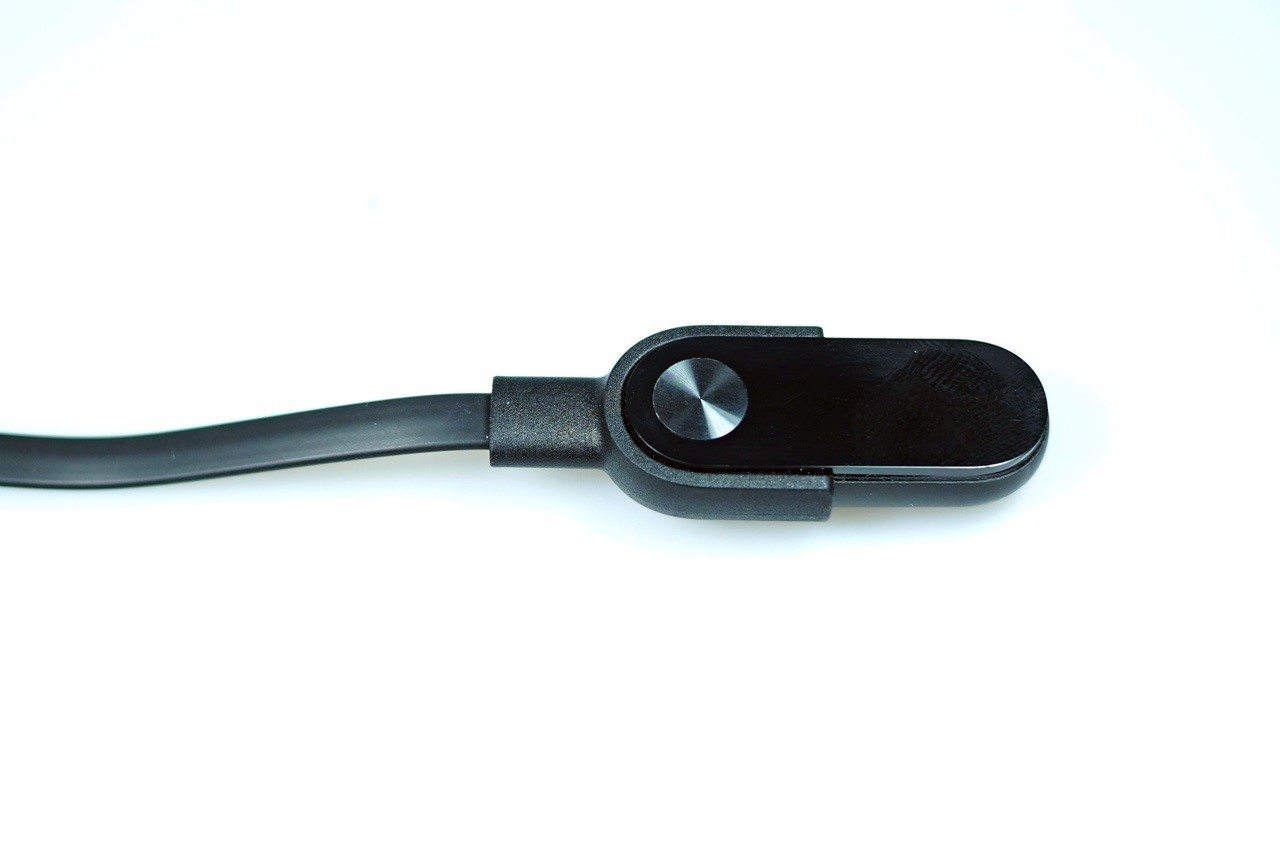 Spodní strana modulu opět nese senzor měřiče srdečního tepu. Po vyjmutí modulu z pásku nepřehlédnete dva zlaté konektory, které slouží k dobíjení pomocí přiložené kolébky. Konstrukce modulu neobsahuje žádné mechanické části, je velmi pevná a při své nízké váze také jistě vydrží nejeden pád na zem. Zpracování je velmi dobré, včetně usazení modulu do pásku. Rozhodně potěší odolnost vůči vodě dle normy IP67, s náramkem se tak můžete například bez obav sprchovat.