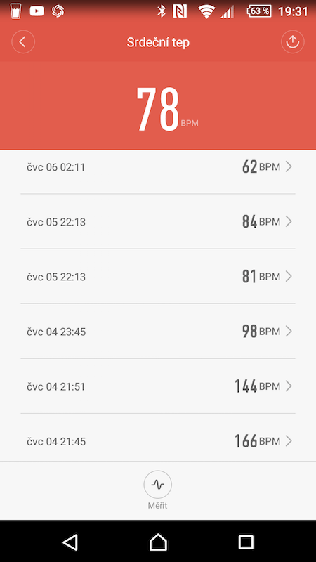 MiBand 2 má identický měřič srdečního tepu jako starší model MiBand 1S. Jedná se tedy o měření pouze na vyžádání a s nutností minimálního pohybu ruky, na které se měření provádí, jinak se neprovede. Z osobní zkušenosti ale mohu říct, že lze měřit tep i za běhu; stačí jednoduše rukou pár vteřin nepohybovat. Chce to trošku cviku, ale dá se. Měření tepu probíhá metodou PPG, jedná se tedy o prosvícení kůže pomocí dvou zelených LED diod a zjištění průtoku krve. Takové měření samozřejmě není zcela přesné, na zjištění orientační hodnoty je ale dostačující.