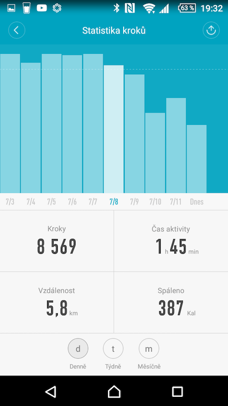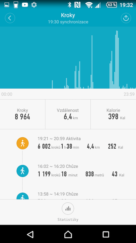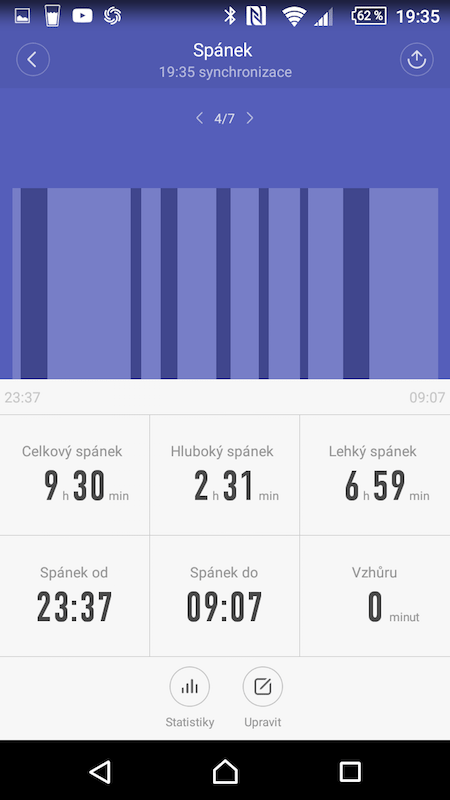 Tyto údaje máte vždy vztažené ke konkrétnímu zobrazení, ale samostatně s nimi nelze pracovat. Stejně funguje statistika spánku. Samotné měření spánku je ale řešeno velmi dobře. Uživatel se o nic nestará a náramek sám, poměrně přesně, rozezná, kdy jste šli spát a kdy jste vstali.