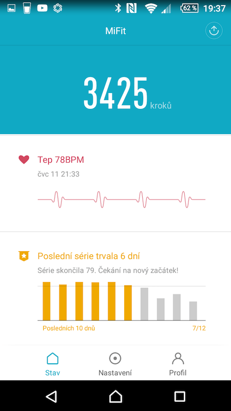 Xiaomi aplikaci MiFit oproti předchozí generaci náramku nijak zásadně nepřepracovalo. Stále se tak budete setkávat s kombinací češtiny i angličtiny, jelikož ne všechny části jsou přeložené. Aplikace vám dokáže zobrazovat denní, týdenní a měsíční statistiky vašich kroků a celkové doby spánku. Pokud si ale budete chtít zobrazit statistku vzdálenosti místo kroků, nebo ukazatel spálených kalorií, nic takového zde nenajdete.