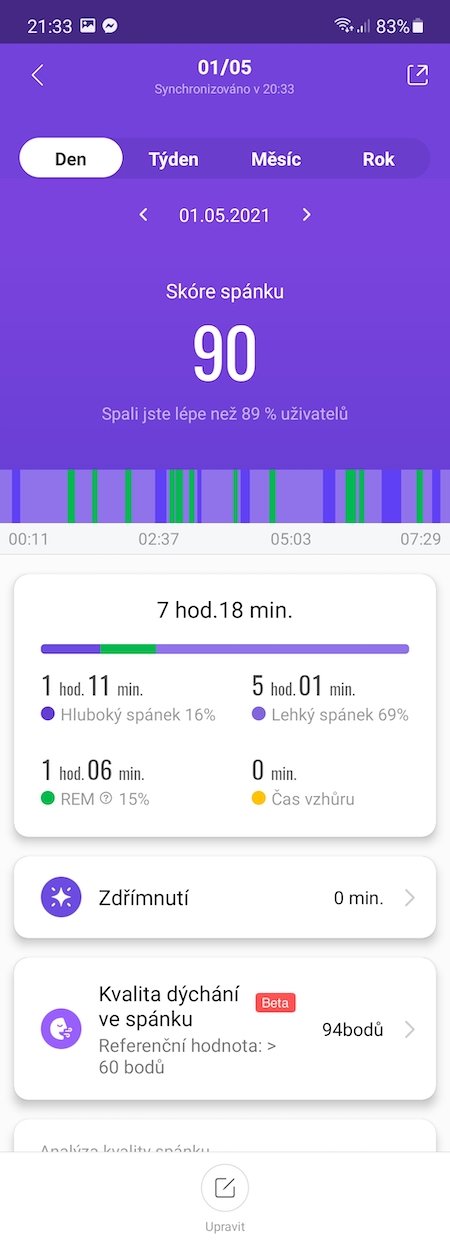 Aktualizováno 25. 6. 2021: Dnes vyšla nová aktualizace, která kromě češtiny do hlavního menu přidává i novou položku Spánek. Přímo na náramku si můžete zobrazit délku posledního spánku, čas usnutí a vstávání a průměrnou délku za posledních 7 dní. Pro podrobnější údaje už ale budete muset otevřít mobilní aplikaci.