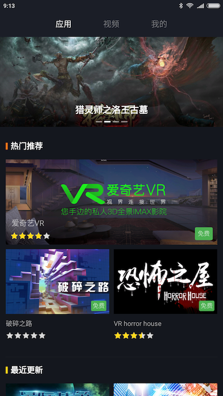 V hlavním nabídce se nachází pole s jednotlivými položkami. K dispozici jsou v současné době zatím jen 360° videa a hry. Právě na hry jsme byly nejvíce zvědaví, a to především ve spojení s dodávaným ovladačem. Bohužel jsme se dočkali pouze zklamání, protože aplikace obsahovala zřejmě nějakou chybu, kvůli které se žádná z her nechtěla spustit.