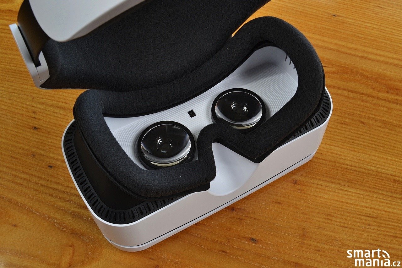 Samotné brýle jsou vyrobené z matného bílého plastu. V přední části je odnímatelný kryt, pod kterým se ukrývá prostor pro umístění smartphonu. Na vrchní straně sídlí kolečko pro zaostření obrazu a nechybí zde ani jedno ovládací tlačítko, která má funkci zpět.