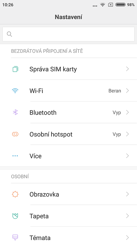 Celé prostředí je pěkně graficky sladěné. Proměnou prošla i nabídka nastavení, kde jsou některé položky řazené lehce odlišně, než je tomu u čisté verze Androidu. Díky vyhledávací liště na vrcholu nabídky ovšem není nalezení potřebné položky žádný problém.