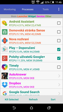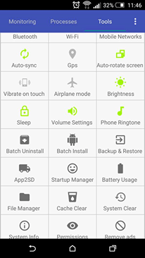 Kromě sledování těchto údajů můžete i zavřít aplikace, které nechcete, aby běžely na pozadí. Najdete zde také velmi rozsáhlý ovládací panel, který nabízí kromě klasických ovládacích prvků, jako je zapnutí/vypnutí WiFi, Bluetooth a podobně, i možnost odinstalovat několik aplikací najednou, přesunout je na SD kartu, nebo třeba využití správce souborů, či možnost zavřít některé aplikace ihned po startu systému.