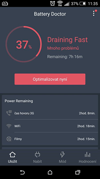 Toho dosahuje také ukončením aplikací běžících na pozadí, vypnutím datových přenosů a zkrácením doby, po kterou zůstane displej rozsvícený. Battery Doctor dále sbírá statistiky nabíjení, a tak se můžete podívat, kdy jste telefon nabili do plné kapacity baterie, nebo kdy jste telefon přebíjeli. K tomu vám aplikace dá i pár tipů – doporučuje nenabíjet baterii déle, než 9 hodin a jednou za měsíc ji vybít pod 20 % a znovu nabít do maximální kapacity, což by mělo zajistit lepší výdrž.