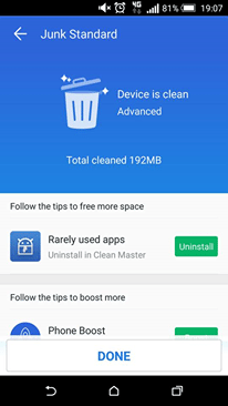Aplikace Clean Master funguje na velmi podobném principu jako ta předchozí. Mezi její výsady patří také ukončení procesů, vyčištění mezipaměti, správa aplikací a nebo například ochrana soukromí, kdy dojde k vymazání veškeré historie z vašich webových prohlížečů.