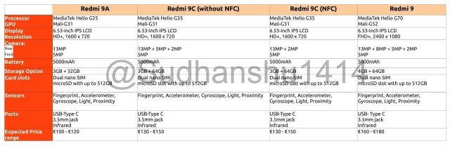 O něco levnější má být model Redmi 9C, jehož displej sice bude mít stejnou úhlopříčku, avšak pouze s HD+ rozlišením. Na čelní straně dále najdeme 5Mpx selfie kamerku, počet fotoaparátů na zadní straně se má lišit podle zvolené varianty – verze s NFC anténou dostane tři kamery v konfiguraci 13 + 2 Mpx, verze bez NFC má mít navíc ještě jednu 5Mpx kamerku.