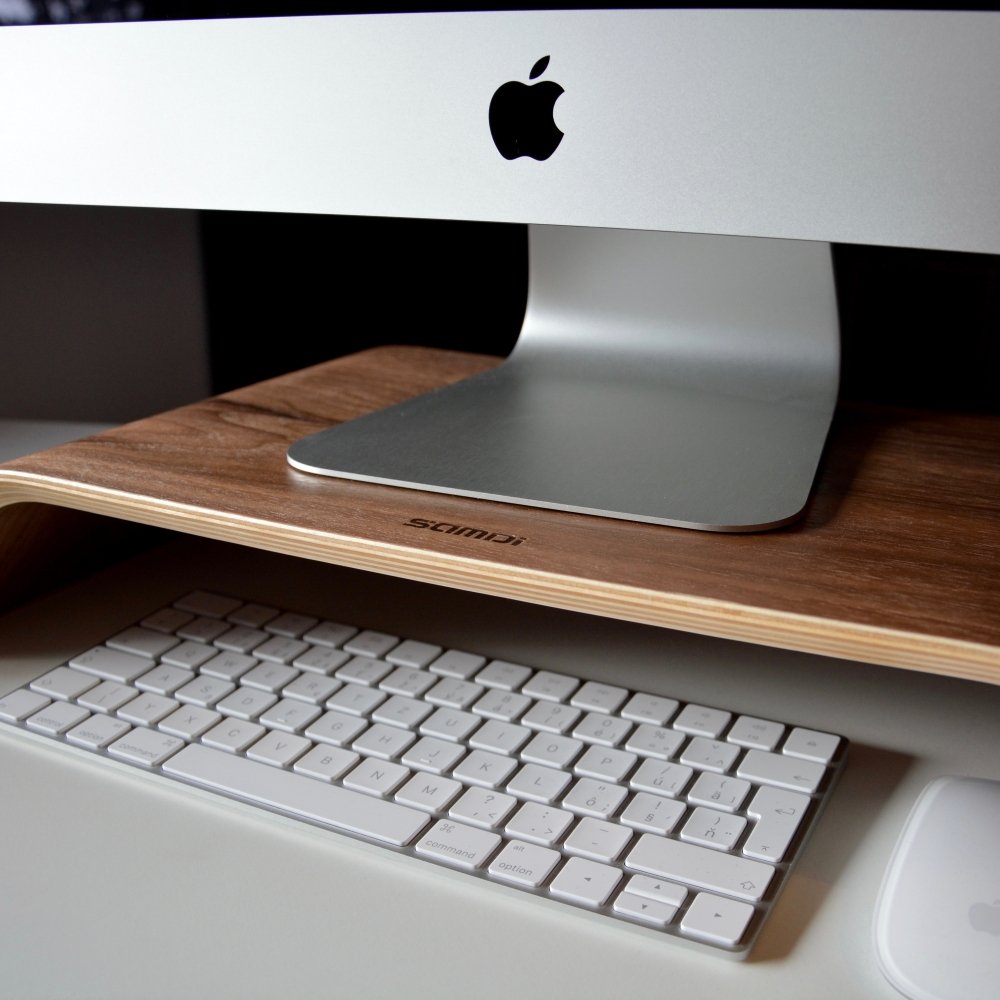 Začal jsem se tedy poohlížet po nějakém pěkném podstavci, kterým bych mohl podložit pracovní iMac. Po chvilce hledání jsem objevil elegantní dřevěný stojánek od značky SAMDI, který u nás prodává internetový obchod InnocentStore.cz. Jeho cena sice není nejnižší (1 600 Kč), ale efektivně mi vyřešil hned několik problémů.
