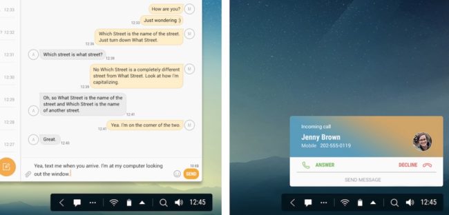 V případě, že máte telefon položený na podložce a pracujete v prostředí DeX, bude vám nový hovor signalizován přímo na ploše monitoru, kde jej můžete přijmout. Mikrofon se používá přímo ten na telefonu, zvuk může vycházet buď z telefonního reproduktoru, nebo z připojeného zařízení přes HDMI.