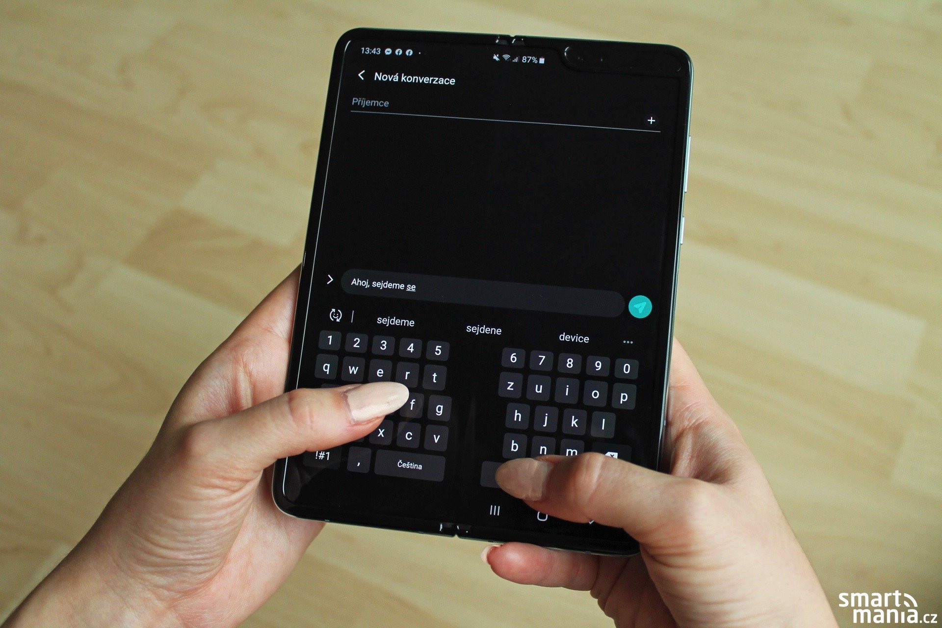 Součástí systému je softwarová klávesnice od Samsungu. Na malém displeji se zobrazuje klasicky, na tom velkém je rozdělena do dvou částí, což přispívá k pohodlnějšímu psaní. Lze samozřejmě i na velkém displeji klávesnici spojit, tuto možnost jsem využíval já. Pozici softwarových tlačítek (v otevřeném režimu) lze nastavit na pravou či levou stranu, nebo na střed.