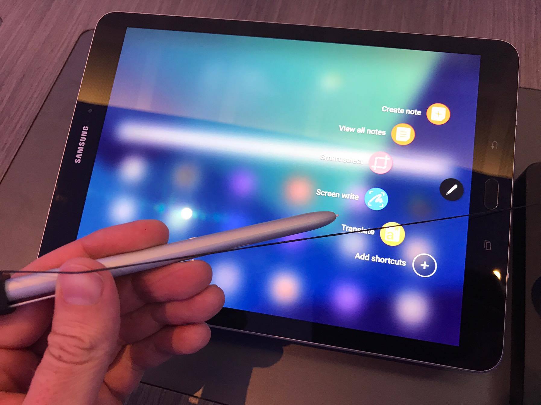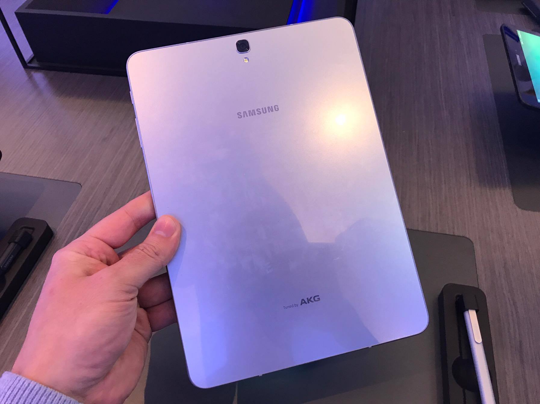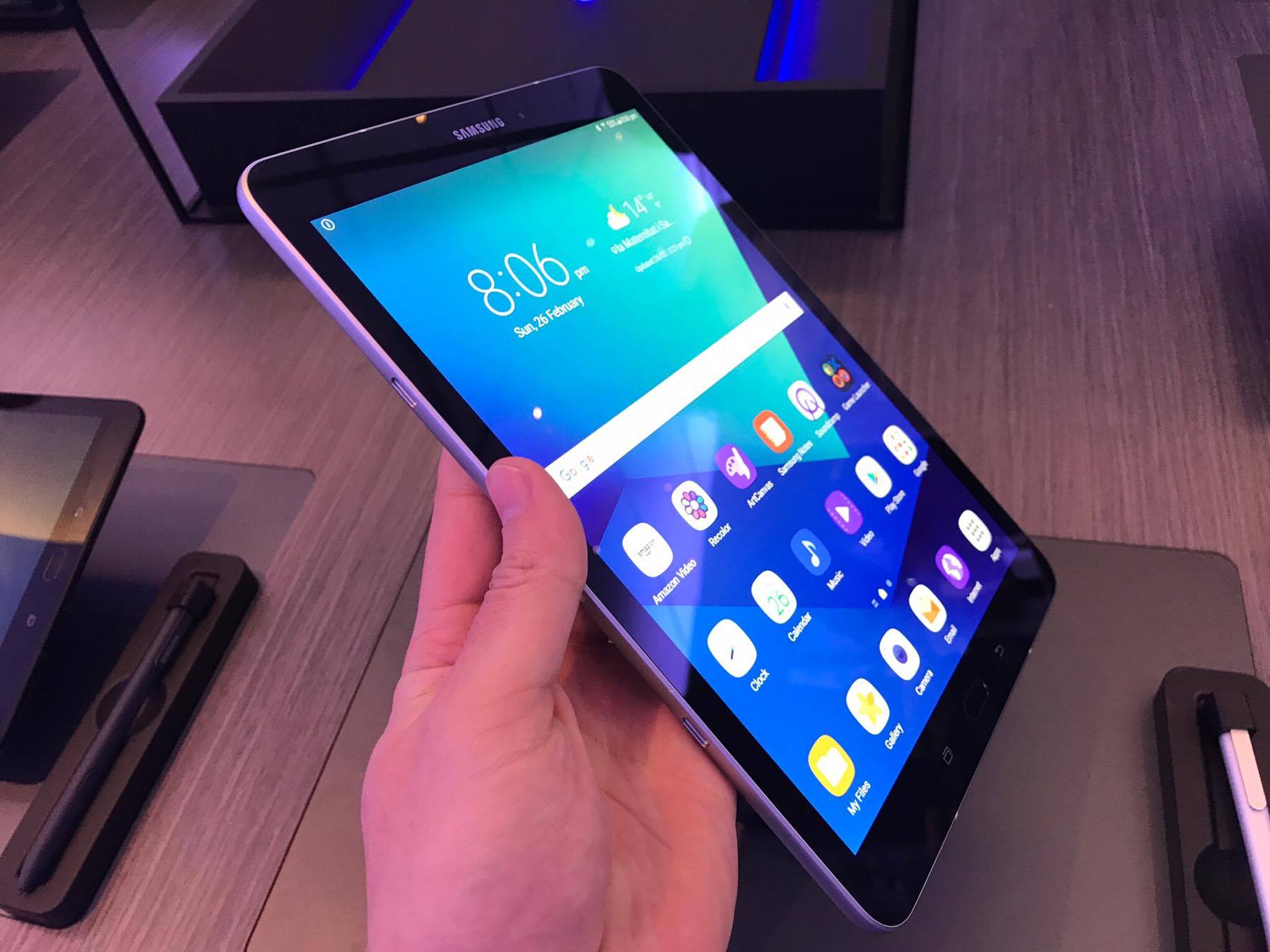 Jelikož se velikost smartphonů stále zvětšuje (chystaný Samsung Galaxy S8+ bude mít displej s úhlopříčkou 6,2 palce), rozhodl se korejský gigant vynechat osmipalcový Galaxy Tab S3 a představil pouze desetipalcový, tedy přesněji 9,7″. Displej je pochopitelně vyroben technologií Super AMOLED, disponuje rozlišením 2 048 × 1 536 pixelů a podporuje obsah s vysokým dynamickým rozsahem. Samotné rozměry tabletu činí 169 × 237,3 × 6 mm, hmotnost je 429, resp. 434 gramů (Wi-Fi / LTE verze).