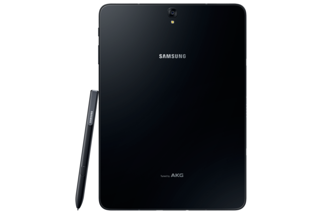 Tablet od Samsungu je tak mírně tenčí a lehčí než 9,7″ iPad Pro od Apple, ve srovnání s Galaxy Tab 2 si ale v těchto disciplínách pohoršil. Stejně jako jeho jablečný konkurent disponuje čtveřicí reproduktorů, které nacházejí blízko rohů, kde je nebude uživatel zakrývat dlaněmi. Zvuk tabletu dodala společnost AKG, která spadá pod konsorcium Harman spadající od loňského roku pod Samsung. Na těle tabletu se dále nachází dvojice fotoaparátů o rozlišení 5 a 13 Mpx a pro Samsung typická konfigurace dvou kapacitních tlačítek a středového domovského tlačítka s vestavěnou čtečkou otisků prstů.