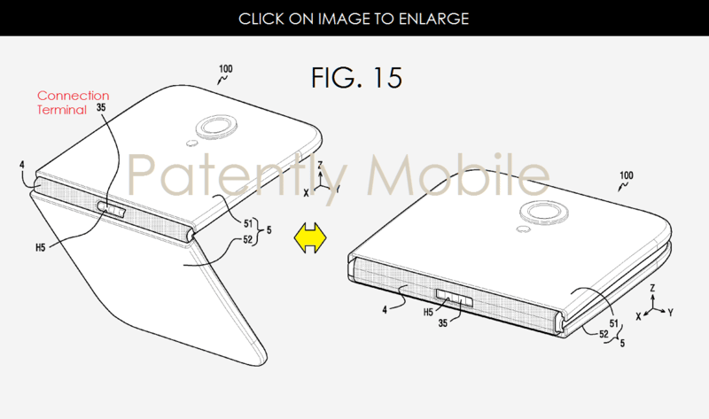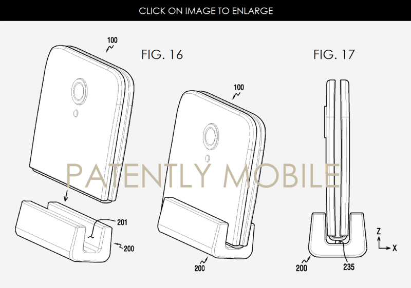 Ve složeném stavu je patrný relativně velký rádius, jehož úlohou je ochránit flexibilní panel před degradací zobrazovacích schopností v namáhaném místě. Další zajímavostí je situování nabíjecího konektoru do kloubu zařízení a vyobrazená dokovací stanice. Je ovšem otázkou, jak Samsung vyřeší případy, kdy uživatel bude chtít zařízení používat a zároveň nabíjet. Návrh zároveň prozrazuje přítomnost čtečky otisků či skeneru oční duhovky.