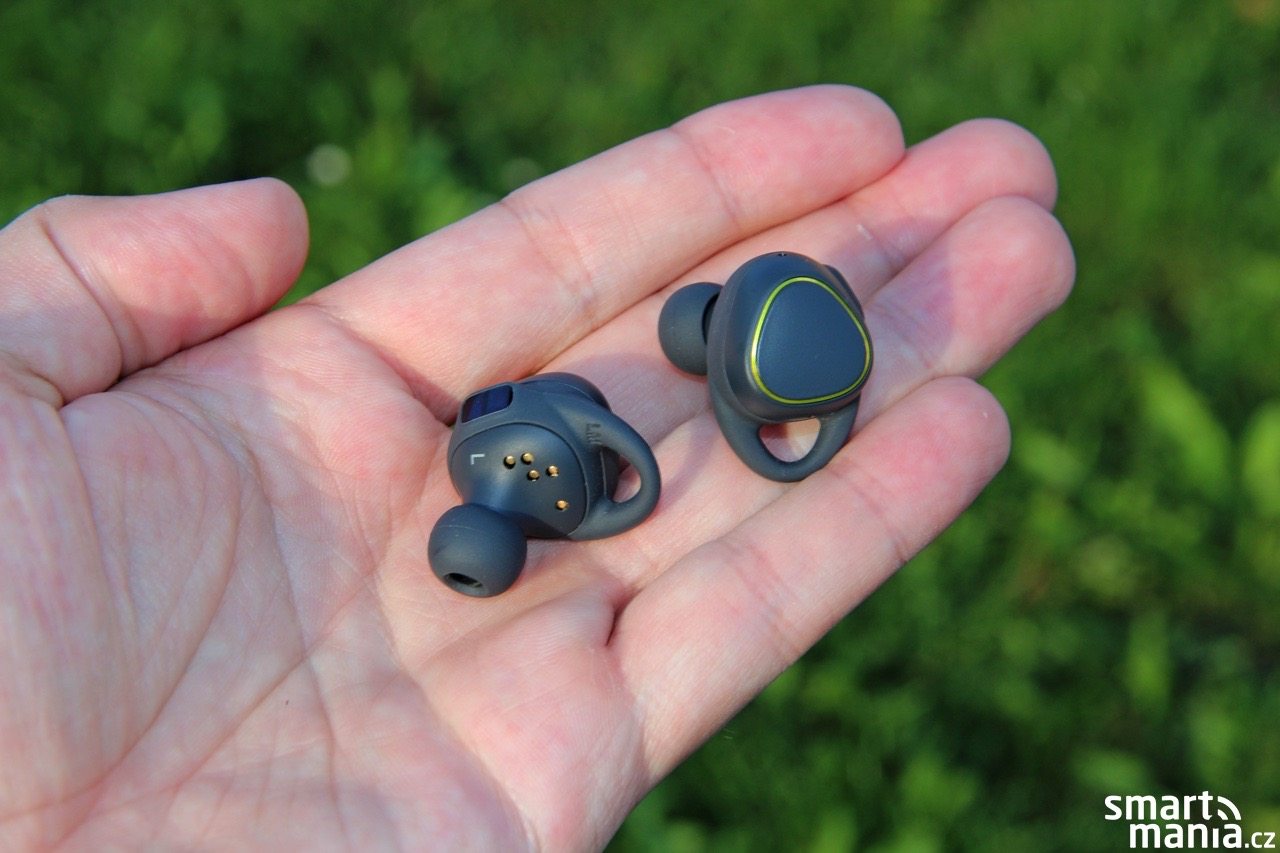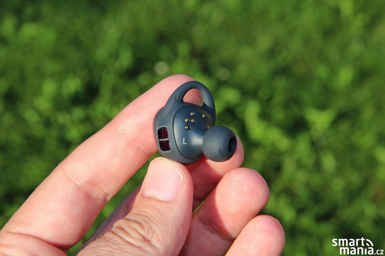 Ve vnitřní části obou sluchátek nelze přehlédnout pětici nabíjecích pinů a senzor pro měření srdečního tepu. Na vnější části najdeme dotykovou plochu pro ovládání a dva mikrofony pro telefonování. V hands-free režimu se vždy používá pouze jedno sluchátko (kvůli úspoře baterie) – skrze aplikaci Samsung Gear si jednoduše nastavíte to primární.