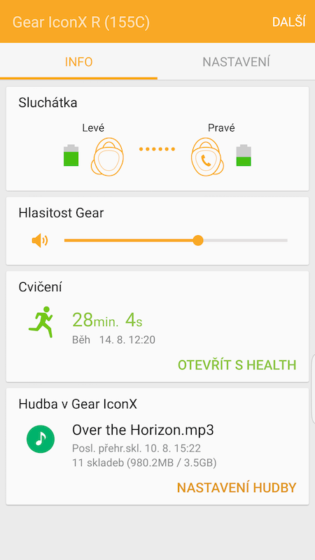V případě, že máte smartphone od jiného výrobce (minimum je Android 4.4+), lze hudbu do sluchátek nahrát skrze PC a nabíjecí stanici. Gear IconX samozřejmě přes Bluetooth (4.1) spárujete také s iPhonem, ale v tomto případě je využijete jen pro přehrávání hudby nebo při volání, na monitoring aktivit si budete muset nechat zajít chuť, jelikož aplikace S Health je dostupná pouze pro Android.