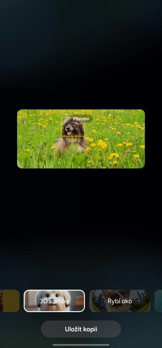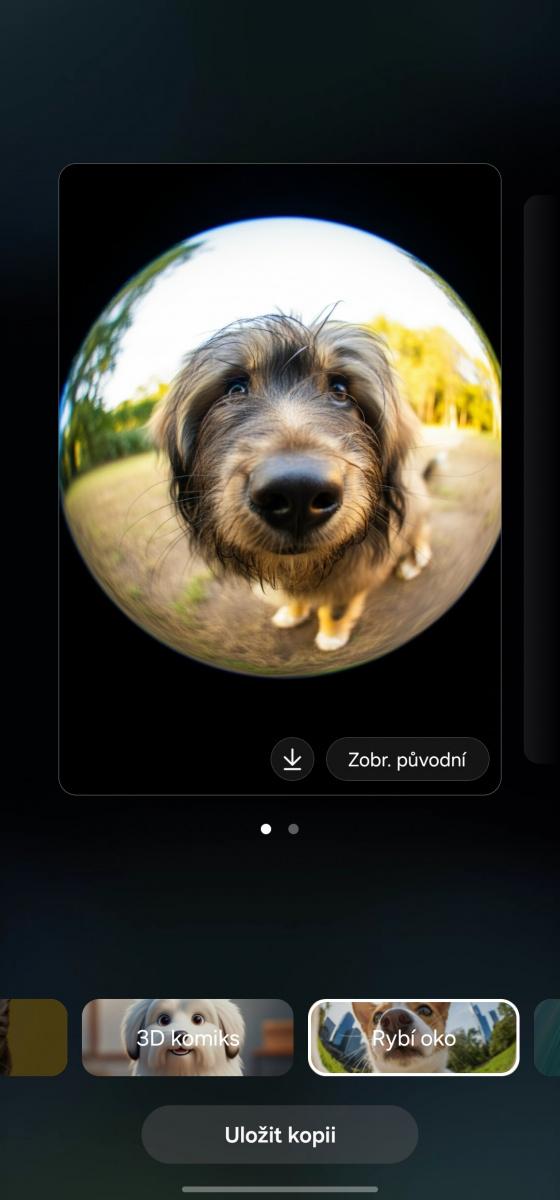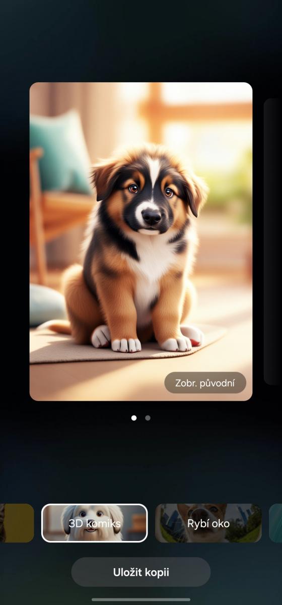 Vtipnou novinkou je možnost vytvářet v portrétním studiu aplikace Samsung Galerie portréty domácích mazlíčků. Dosud to bylo možné pouze s lidskými obličeji, nyní je možné nechat provádět AI úpravy i na fotografiích koček nebo psů – stačí z galerie vybrat snímek psa nebo kočky a v AI editaci si zvolit, zda má být výsledný obrázek stylizován do 3D komixu, do efektu rybího oka nebo do olejomalby. Nutno ale podotknout, že tímto způsobem nedojde k úpravě stávajícího snímku, ale k vytvoření nového portrétu, u kterého je podoba s původním zvířetem spíše náhodná.