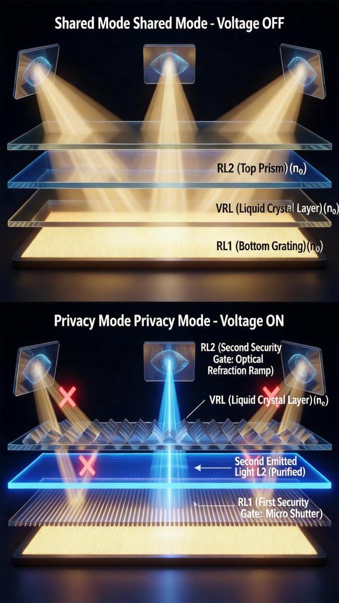 Na jakém principu Privacy Display funguje? To popsal jiný známý leaker, Ice Universe. Ten tvrdí, že po aktivaci tekuté krystaly změní svůj stav a tím pádem i odrazivost. V okamžiku aktivace se projeví mikroskopická mřížka, takzvaná difrakční struktura, vyrytá do povrchu první refrakční vrstvy, která funguje jako série mikroskopických „žaluzií“.