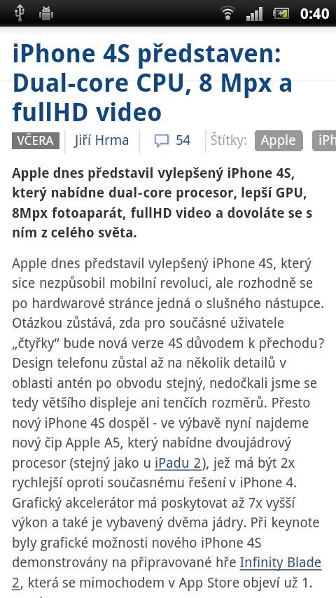 Podíl na slušném výkonu má i 512 MB operační paměti RAM, ze které vám po naběhnutí systému zůstane volných okolo 200 MB. V interním úložišti je po prvním spuštění volných 325 MB, další data můžete umístit na 4GB microSDHC kartu, která je součástí balení.