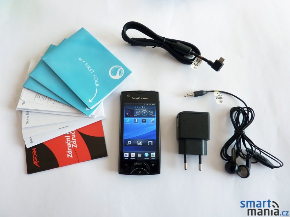 Součástí balení je kromě zařízení samotného také akumulátor s kapacitou 1 500 mAh, adaptér cestovní nabíječky, napájecí/synchronizační USB kabel s microUSB koncovkou a samozřejmě i pecková stereo sluchátka (model MH410) s 3,5mm konektorem. Náročnější uživatele je zřejmě brzy vymění za jiné, celkově ale kvalita zpracování zvuku není zas tak špatná a ve srovnání se standardními sluchátky, která ke svým telefonům dodává například HTC, hrají ty od Sony Ericssonu lépe. Na jejich těle najdeme plastové ovládací centrum s mikrofonem a tlačítkem pro přijetí hovoru.