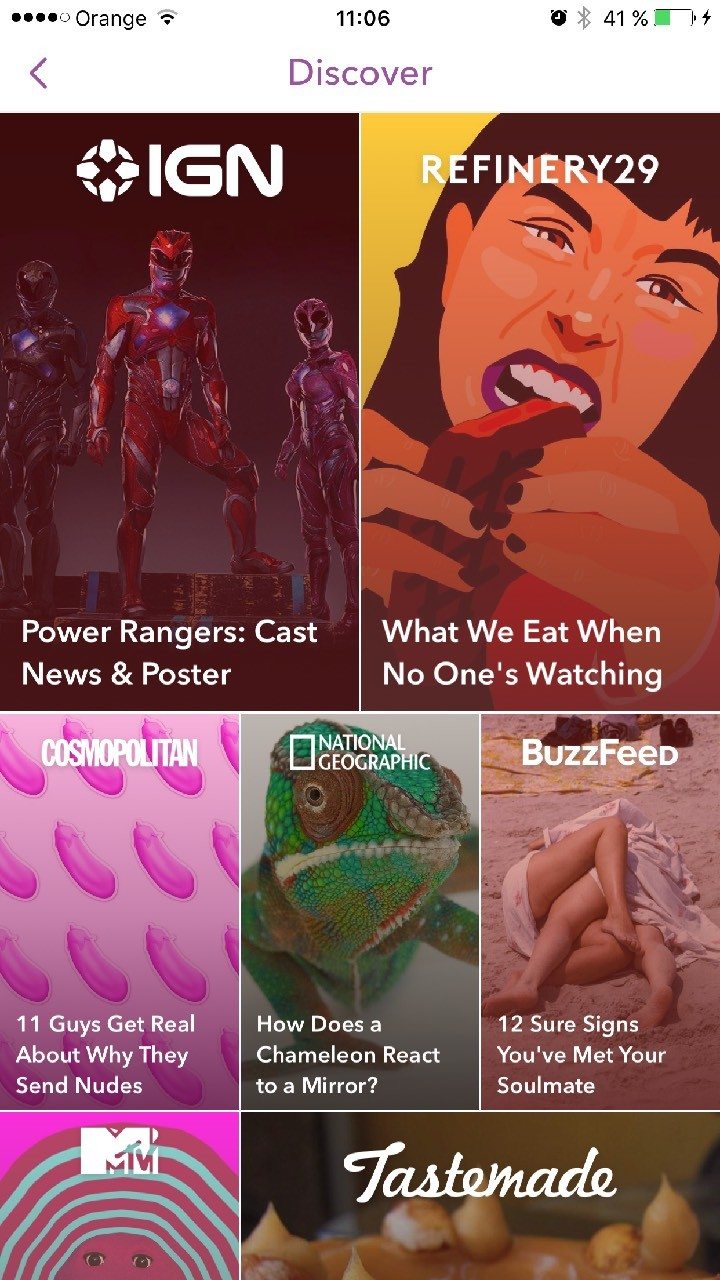Vlevo se nachází okno pro chat a vpravo zase sekce „Stories”, na které naleznete mimo obsahu (příběhů) svých přátel i obsahy různých televizních stanic, slavných hvězd nebo velkých firem. Pokud se ještě jednou posunete směrem doprava, dostanete se do sekce „Discover”, která zobrazuje opět obsahy různých časopisů atd., kde najdete obsah i ve formě textu (články), které můžete odebírat.