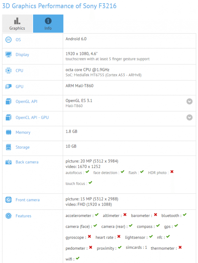 Ten lépe vybavený nese kódové označení F3216. Jeho displej má mít Full HD rozlišení a o pohon se má starat čipset MediaTek Helio P10 se 2 GB RAM za zády. Telefon zřejmě bude chtít zaujmout fotoaparáty – hlavní má mít rozlišení 21 Mpx, čelní kamerka pak 16 Mpx. Na tuto porci megapixelů jsme byli zvyklí u telefonů řady Xperia C, je tedy možné, že testovaný smartphone do této řady bude patřit také; byť v kompaktním kabátku. Telefon má dostat 16 GB vnitřní paměti, systém pak bude poslední Android 6.0.
