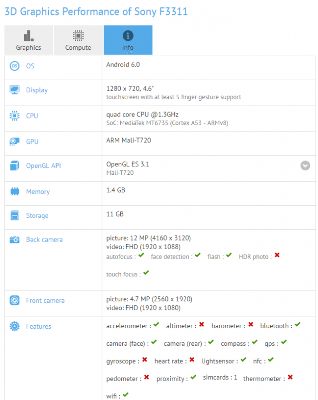 Druhý telefon nese označení F3311 a má se jednat o slabšího bratříčka. Rozlišení displeje je pouze 720 × 1 280 pixelů, procesorem má být slabší MediaTek MT6735. Benchmark dale odhaluje 1,5 GB RAM a 16GB úložiště, konfigurace fotoaparátů má být 13 a 5 Mpx. I tento telefon byl otestován s Androidem 6.0.
