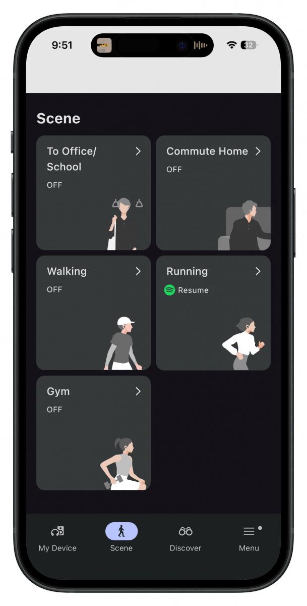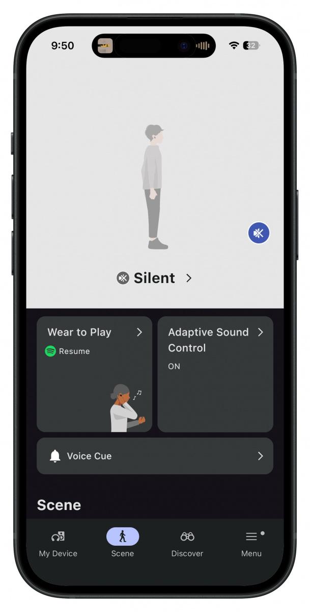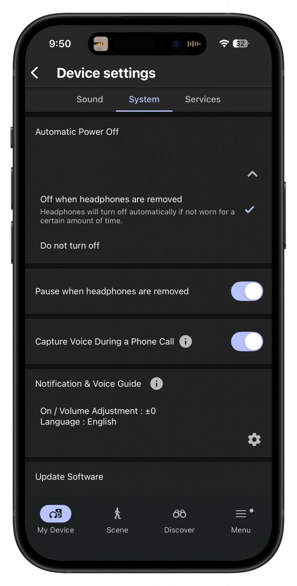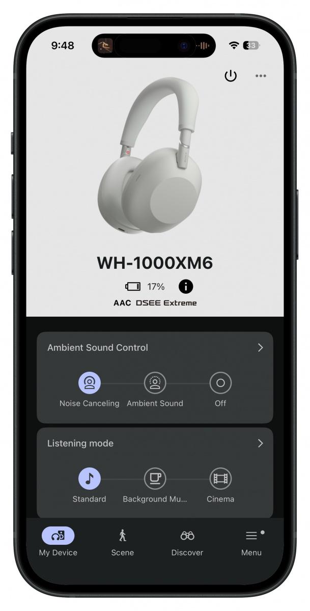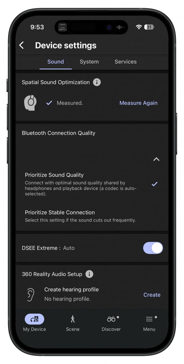 Ve vedlejší záložce Scene je možné nastavit funkci Wear to Play, která aktivuje přehrávání při nasazení sluchátek na hlavu automaticky. U ANC je samozřejmě možné přepínat mezi ambientním režimem a klasickým odhlučněním. Nabízí se také funkce Speak-to-Chat, která na moment ztiší poslech při mluvení. Hlouběji v nastavení najdete také aktivaci funkce DSEE Extreme nebo nastavení prostorového poslechu 360 Reality Audio Setup. V oddílu Discover se ukrývají různé praktické tipy nebo historie vašeho poslechu. Aplikace bohužel neumí česky, takže je potřeba orientace v angličtině. Řekl bych, že její přehlednost se postupně zlepšuje, stále je ale nabitá funkcemi, takže občas člověk při hledání zabloudí. Žádné závažné nedostatky jsem ale neobjevil.