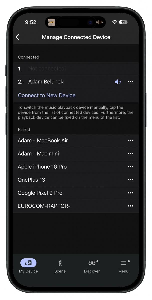 Své vlastní nastavení si můžete jednoduše také uložit pro příští použití. Osobně jsem byl s naladěním sluchátek spokojen a vyhovoval mi rovný profil bez velkých úprav. Funkce Adaptive Sound Control upraví poslech pro dané situace, ať už je to sezení, chůze nebo běh. Oceňuji také přehledný soupis spárovaných a připojených zařízení, takže při vícebodovém připojení můžete jednoduše přepínat mezi zařízeními. Ačkoliv toto nejspíše v aplikaci činit nebudete, máte samozřejmě možnost přepnout přehrávanou skladbu nebo změnit její hlasitost.
