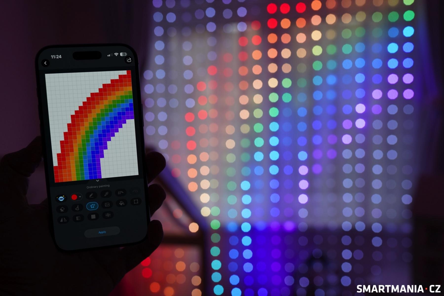 Díky tomu tak kromě běžného svícení dokáží vykreslit nespočet různých motivů, které si buď vyberete z přednastavené nabídky, nebo popustíte uzdu fantazii a vytvoříte si vlastní. Jednotlivé diody jsou individuálně mapovatelné pomocí speciální aplikace, díky čemuž lze na tuto chytrou oponu promítnout třeba text nebo například i animovaný GIF.