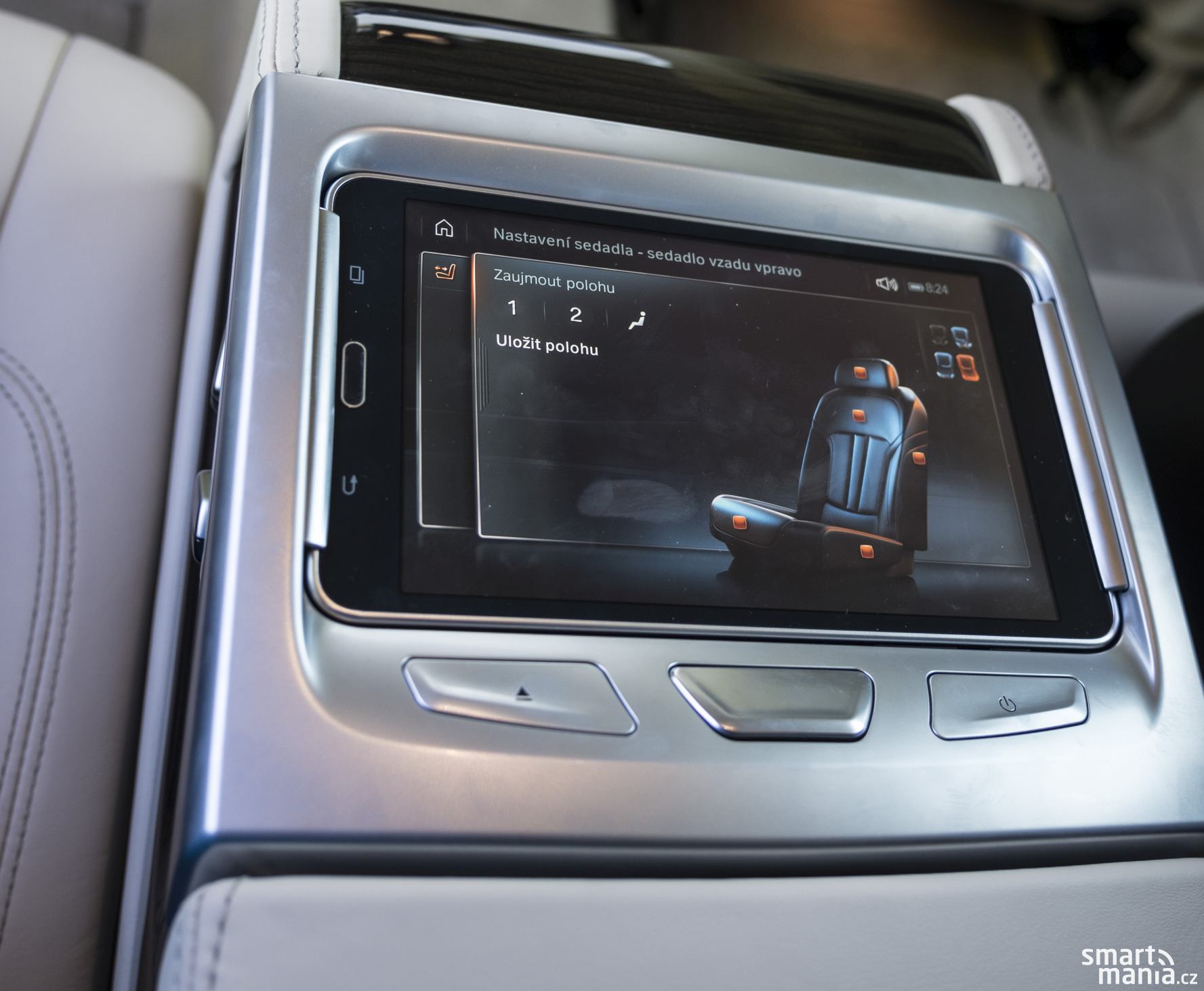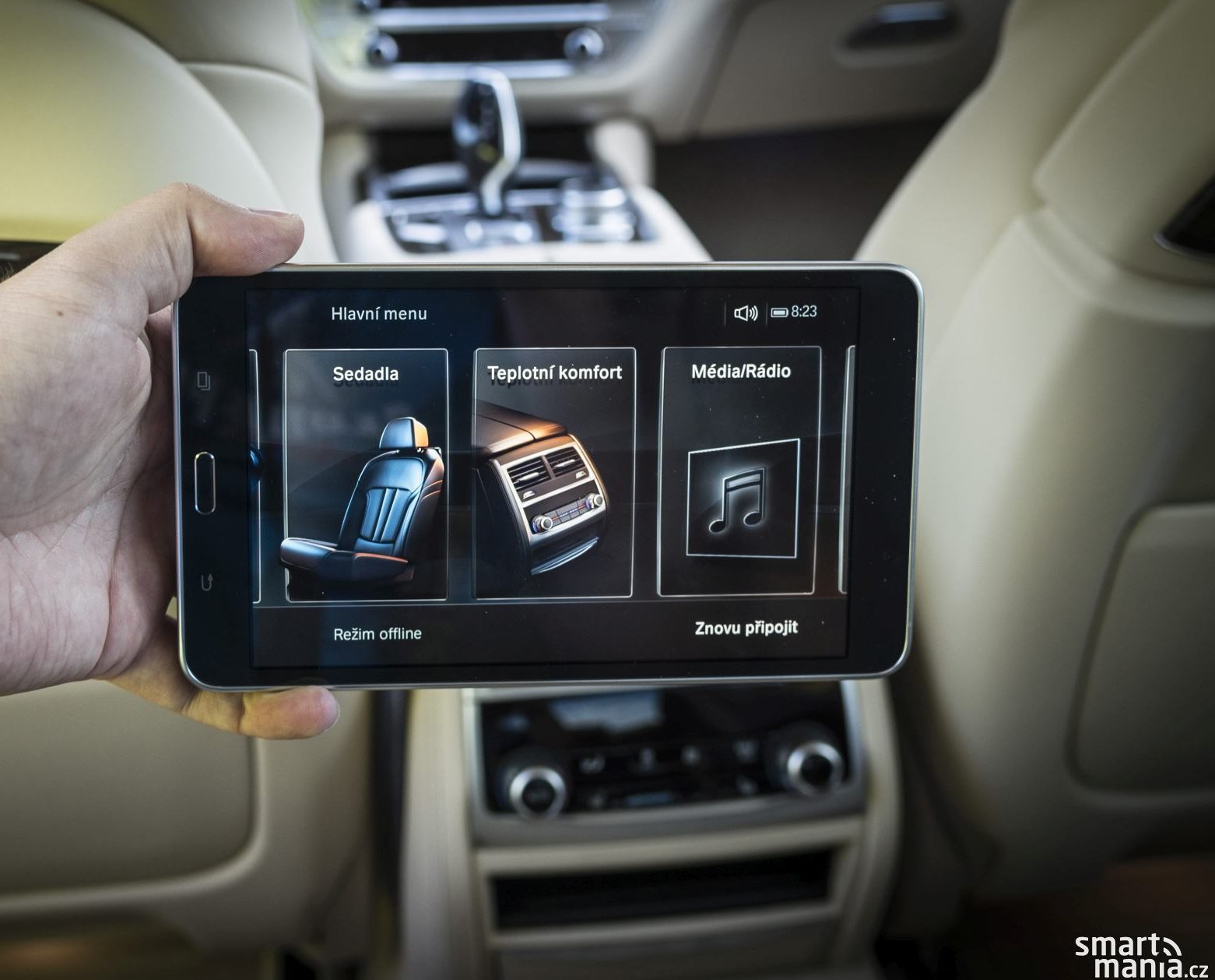 Když už se vám spát nechce, můžete si sklopit prostřední konzoli a prozkoumat, co je uvnitř. Ejhle, tablet. Od Samsungu. A běží na něm aplikace od BMW. Přes tablet si tak můžete konfigurovat sedadla, ladit klimatizaci, nebo si vybírat hudbu, která vás bude obklopovat. A to že hraje fantasticky, to snad nemusíme připomínat. Z nadstavby, nebo snad přesněji řečeno aplikace BMW, můžete i vyskočit a pak používat zařízení jako každý jiný tablet s Androidem. V konzoli v autě se také dobíjí, takže vždy budete mít plnou baterii. Tablet jako součást auta, to je zkrátka za 100 bodů.