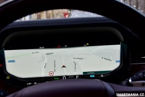 Testovací kousek disponoval head-up displejem, který je dobře čitelný a ukazuje veškeré důležité informace. Ještě než se dostanu ke středovému displeji, musím zmínit zpětné zrcátko. To lze přeměnit v obraz zpětné kamery, která se nachází ve žraločí ploutvi na střeše, Vzad tedy uvidíte perfektně, i pokud vzadu uprostřed sedí váš dvoumetrový kamarád.