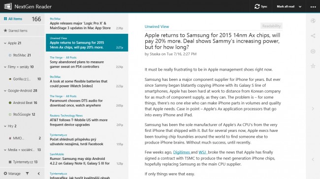 Povedená čtečka RSS kanálů, kterou jistě znají majitelé telefonů s operačním systémem Windows Phone. V minulosti podporovala služby dnes již ukončeného Google Readeru, nyní je nejsnazší cestou synchronizace s Feedly. Uživatelské rozhraní je přehledné a funkční. Aplikace funguje stabilně a svižně, na živé dlaždici může zobrazovat náhledy nejnovějších článků. Integrovány jsou i další služby, není tak problém zajímavé články odeslat na pozdější čtení do čtečky Pocket. Pokud chcete číst RSS zdroje na tabletu s Windows 8/RT je Nextgen Reader nejlepší volbou.