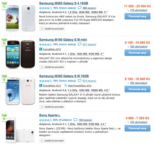 Žebříčku chytrých telefonů na Heureka.cz vládne Samsungu