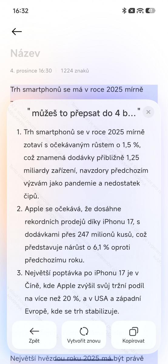 V aplikaci Poznámky je HyperAI naprosto geniální – sumarizuje, přepisuje, opravuje gramatiku nebo překládá do 30 jazyků včetně češtiny. Omezuje se na 4 tisíce znaků, ale pro běžné úkoly stačí. Vyzkoušeli jsme přepsání dlouhého chatu do stručného resumé pro meeting, šlo to rychle a přesně.