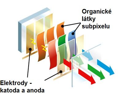 Mezi displeji LCD a OLED je zásadní rozdíl. Zatímco LCD je založené na zobrazování výsledného obrazu pomocí tekutých krystalů umístěných mezi skleněnými destičkami kde podsvícení obstarává série LED diod, OLED kýženého výsledku dosahuje využitím technologie organických elektroluminiscenčních diod, které už žádné přídavné podsvícení nepotřebují (každý svítí sám o sobě) a každý jeden pixel je ovládaný dvěma vlastními tranzistory – jeden ovládá nabíjení a vybíjení kondenzátoru, druhý slouží jako stabilizátor proudu.