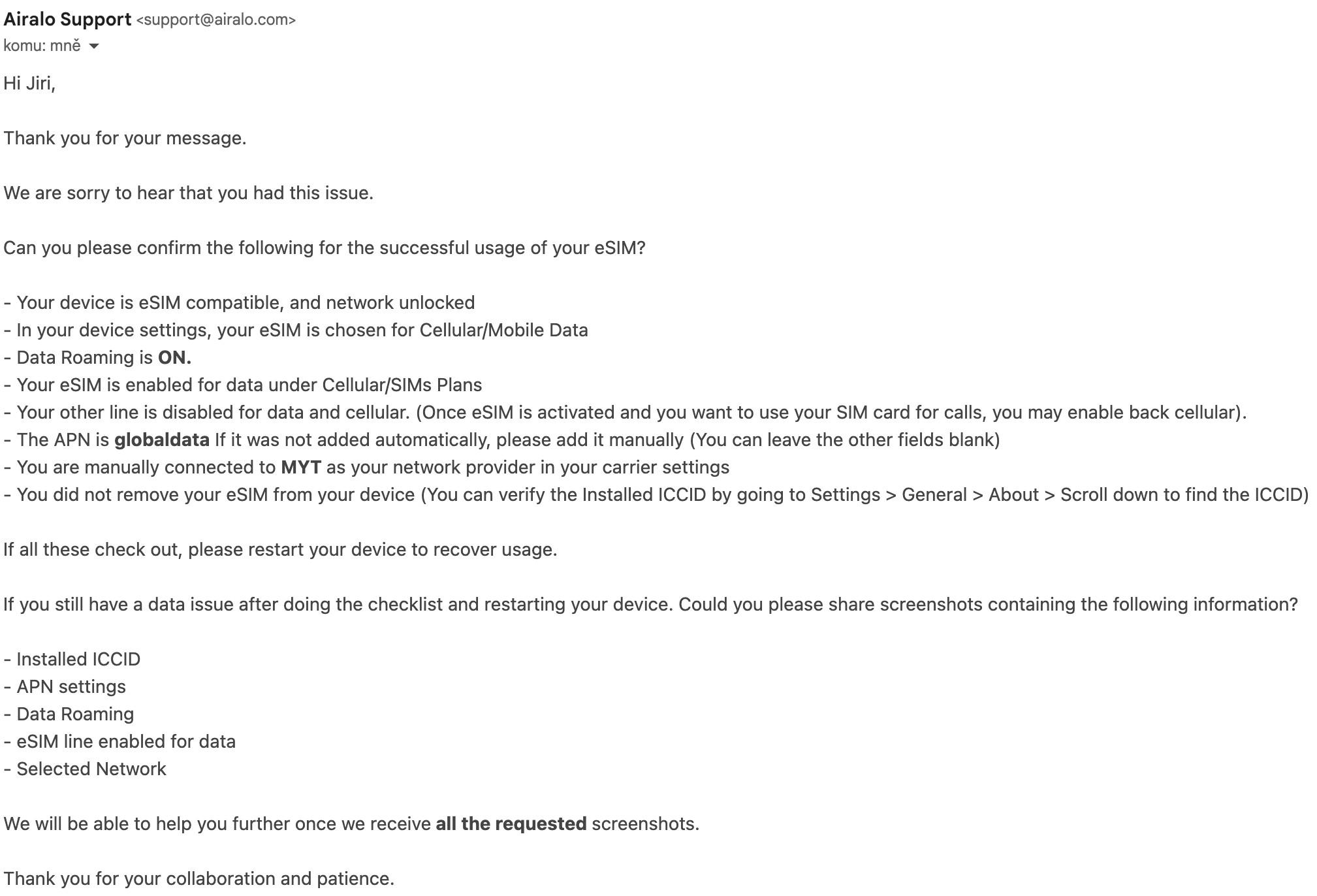 Skrze nabídku Profil – Kontaktujte nás v mobilní aplikaci jsem odeslal popis problému (v angličtině). Odpověď jsem dostal 47 minut po odeslání. Airalo by mělo mít i podporu v češtině, nicméně pro co nejrychlejší vyřešení jsem volil angličtinu. Zkusil jsem aplikovat všechny doporučené tipy (viz screenshot níže), nicméně eSIM se stále nedokázala přihlásit do sítě.