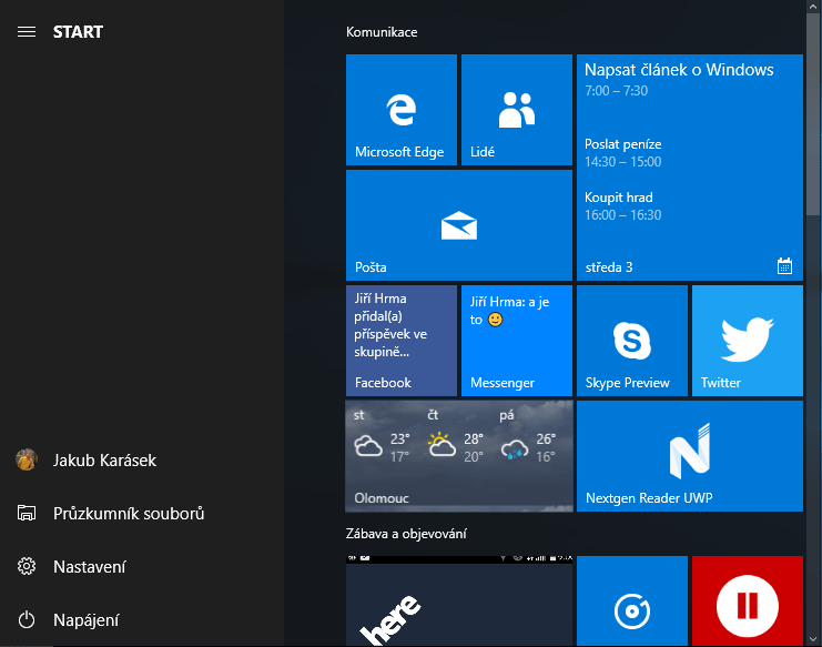 Patrně nejviditelnější změnou Windows 10 oproti Windows 8.1 je nabídka Start, která spojuje to nejlepší z klasického světa Windows a světa dlaždic. Microsoft však evidentně stále není s podobou Startu spokojen a tak po letní aktualizaci nezůstává kámen na kameni. Tlačítka pro vypnutí/restartování/uspání počítače a odhlášení uživatele se přesunula do úzkého proužku vlevo, přičemž pravý význam jednotlivých položek se dozvíte až po stisknutí tlačítka hamburger vlevo nahoře. Do tohoto úzkého proužku je možné přidat ikonky dalších systémových aplikací, jejich výběr je však poměrně omezen.