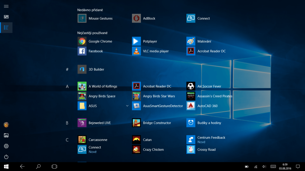 Microsoft v letním updatu klade důraz na zobrazení seznamu všech aplikací, ten již není nutné otevírat zvlášť, ale je přímo přístupný na nabídce Start pod seznamem nejčastěji používaných a naposledy nainstalovaných aplikací. Vyhledávání podle počátečního písmene zůstává, stejně tak i pravá část s připnutými dlaždicemi.