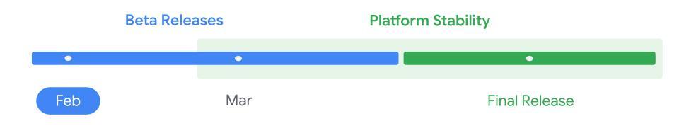 Podle zveřejněného harmonogramu se zdá, že Google má v plánu vydat pouze dvě beta verze, ta druhá by měla přijít někdy v březnu. Poté již bude následovat ladění stability, které vyústí ve vydání ostré verze pravděpodobně někdy v červnu.